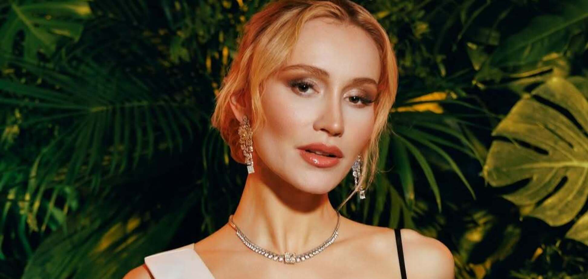Головною родзинкою є білий легкий шлейф, який спадає з плечей наче мантія, додаючи образу невагомості та королівського шарму. Її хвилясте світле волосся та природний макіяж гармонійно доповнюють розкішний образ.