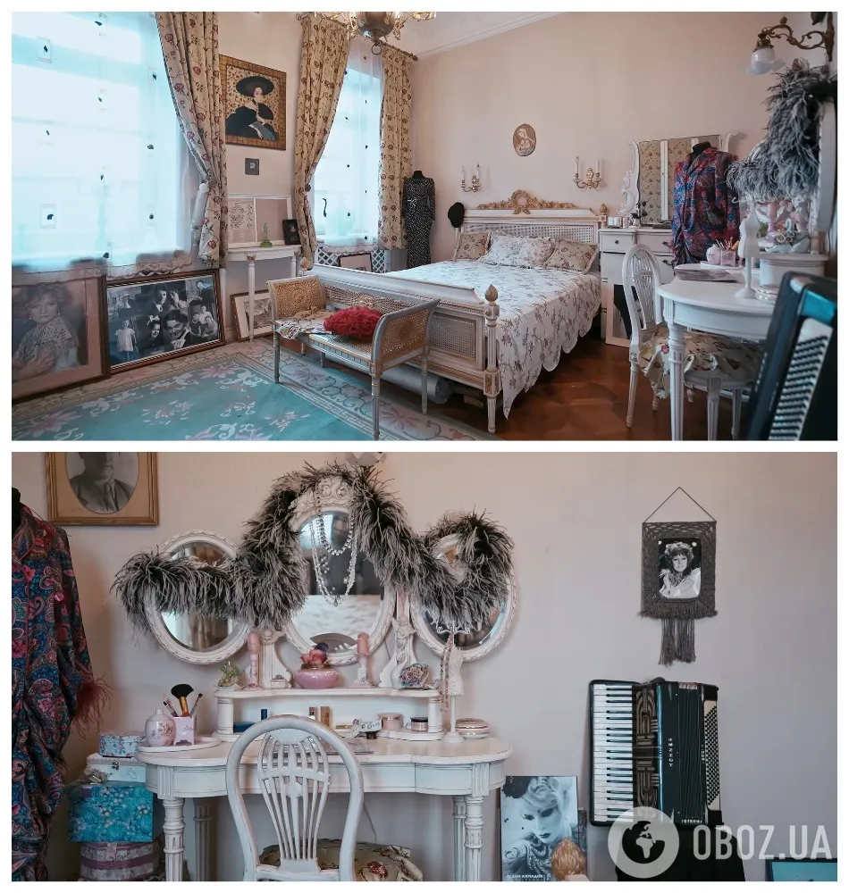 Поруч – антикварний секретер, знайдений на блошиному ринку, і сукні Гурченко. Майже всі вбрання вона доопрацьовувала сама: додавала пір’я, стрази, банти, переробляла силуети, хоча шила переважно вручну.
