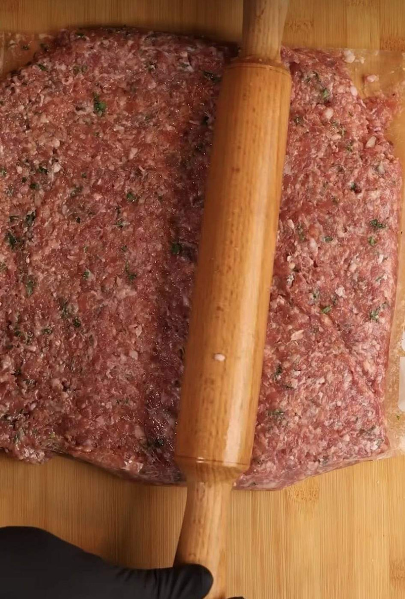 "1. Обсмажте нарізані шампіньйони до золотистості, підсоліть, поперчіть. Шпинат швидко прогрійте на сковороді до м'якості. 2. Перекладіть фарш у пакет-слайдер, додайте воду, цибулю, часник, яйце, спеції та зелень. Закрийте пакет і добре перемішайте. Розрівняйте фарш качалкою прямо всередині пакета, розріжте пакет і ще раз розкачайте до рівного шару", - порадив Ектор.