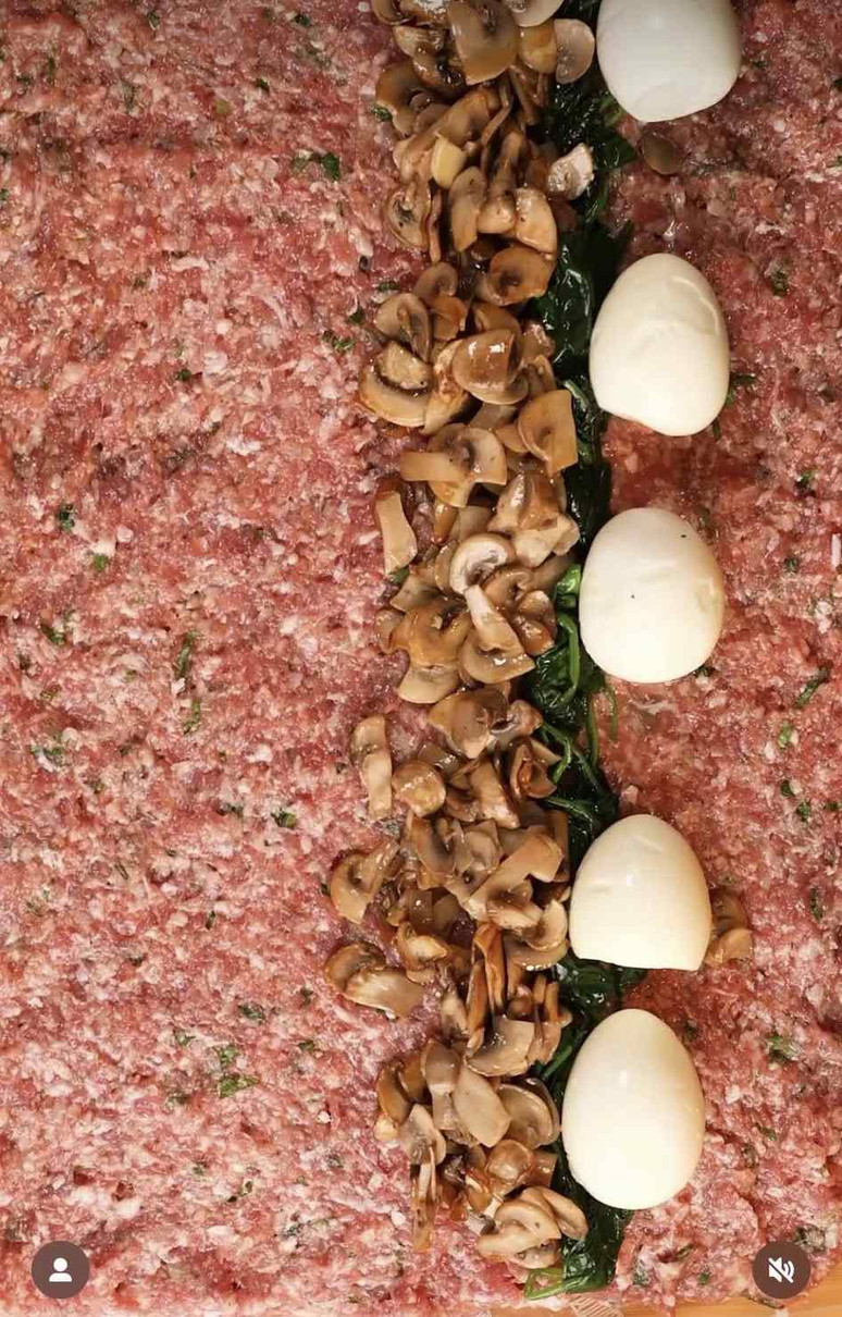 Він дав рецепт м'ясного рола з шампіньйонами, шпинатом, вареними яйцями та сиром.