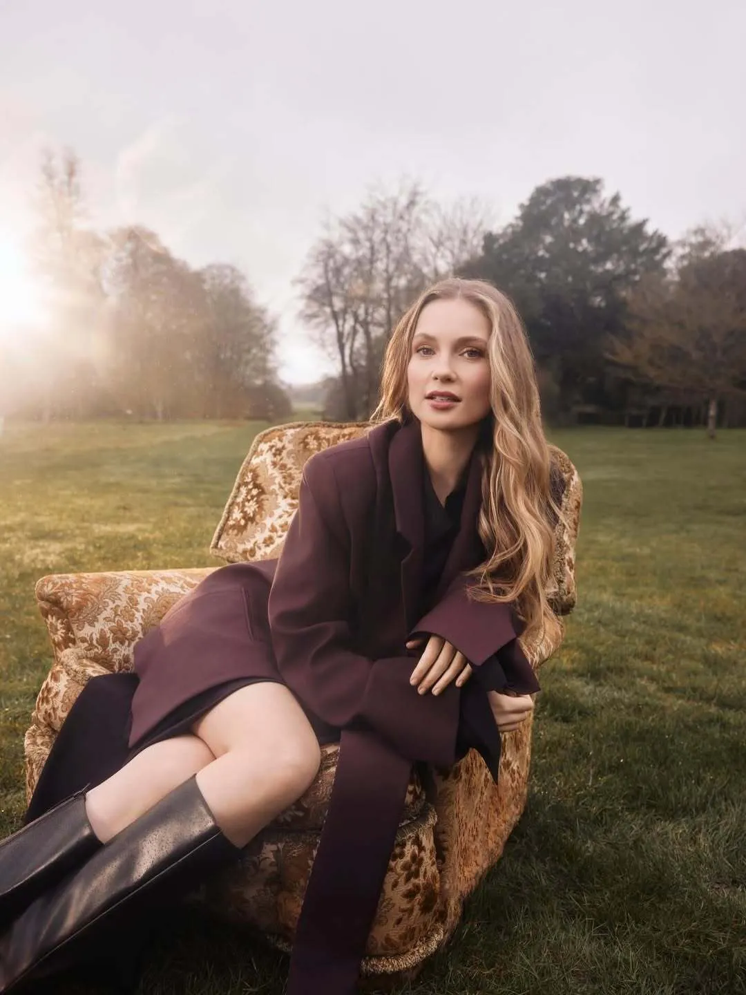 Британська акторка Ганна Додд, яка виконує роль Франчески у серіалі "Бріджертони", з’явилася на нових кадрах з промоакції серіалу у вбранні від українського бренду Synopsis Collective. Для зйомки акторка обрала бордовий костюм, який складався зі структурованого жакета, легкої блузи та спідниці.