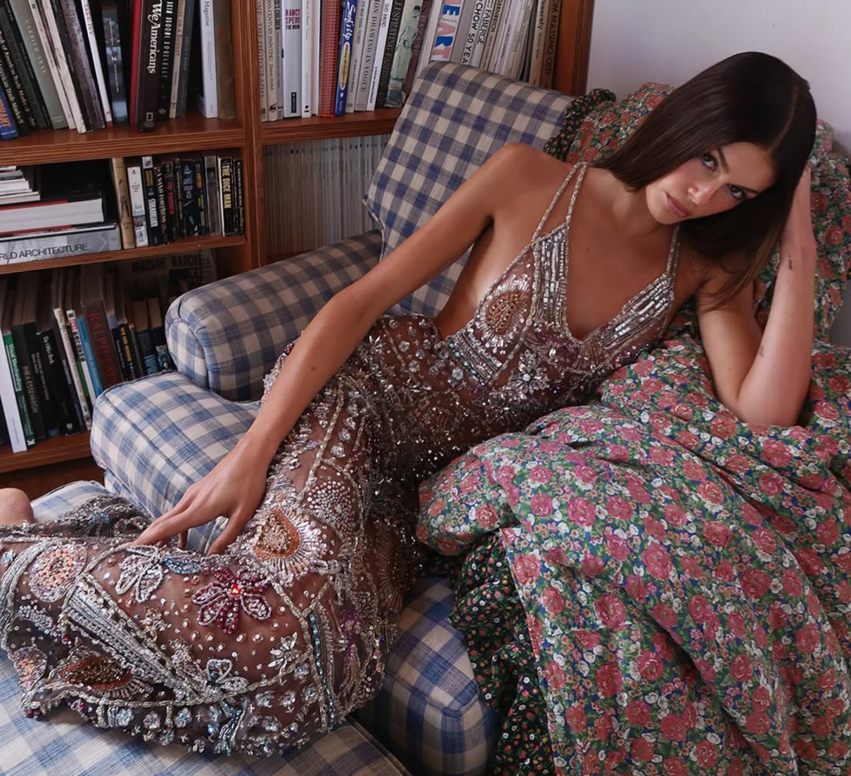 Гербер похвалилася стрункістю у прозорій тканині з блискучими квітами