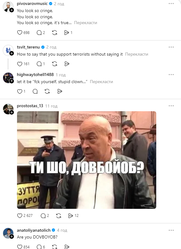 У коментарях також й інші різкі висловлювання на адресу артиста, зокрема, від українських публічних осіб. Користувачі нагадують про воєнні злочини РФ.