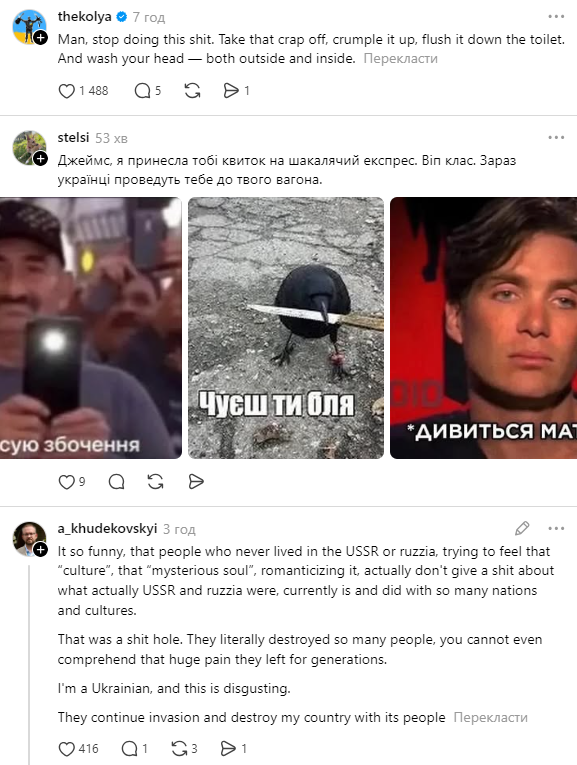 "Так смішно, що люди, які ніколи не жили в СРСР чи Росії, намагаючись відчути ту "культуру", ту "таємничу душу", романтизуючи її, насправді абсолютно не переймаються тим, чим насправді були СРСР і Росія, чим вони є зараз і що вони зробили з такою великою кількістю народів і культур. Це була справжня діра. Вони буквально знищили так багато людей, що ви навіть не можете уявити того величезного болю, який вони залишили на покоління".