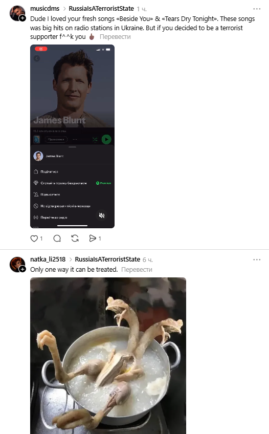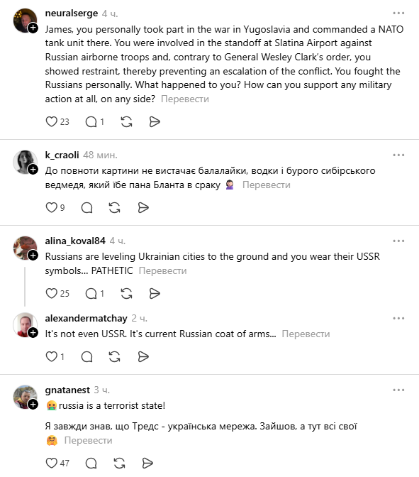 Серед тих, хто відреагував публічно, – український музикант і засновник "Культурного десанту" Миколай Сєрга. Він різко розкритикував Бланта, порадивши "зняти це барахло" та "змити в унітаз", а також додав, що артисту варто "помити голову – і зовні, і всередині".