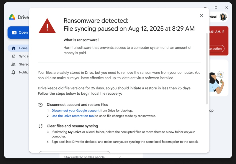 Якщо на ПК встановлена настільна версія «Google Диска», додаток автоматично призупинить синхронізацію файлів у хмарі, як тільки виявить програму-вимогателя. Звичайні користувачі побачать попередження про програму-вимогателя та інструкції щодо подальших дій, ІТ-адміністратори також отримають сповіщення електронною поштою.