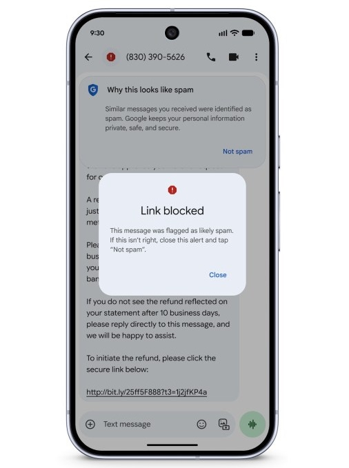 Для власників смартфонів Pixel компанія запустила вбудований захист від шахрайських і спам-повідомлень. Тепер функція виявлення спам-посилань у Google Повідомленнях стане доступною всім користувачам. При натисканні на підозріле повідомлення додаток видасть попередження і заборонить відвідування цієї сторінки.