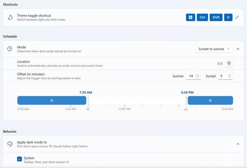 Тепер же Microsoft випустила PowerToys 0.95 для Windows 11, в якій реалізована функція автоматичного перемикання між світлою та темною темами оформлення програмної платформи в залежності від часу доби. Користувач може активувати відповідну опцію і змінити налаштування таким чином, щоб протягом дня була активна світла тема, а після заходу сонця автоматично включалася темна.