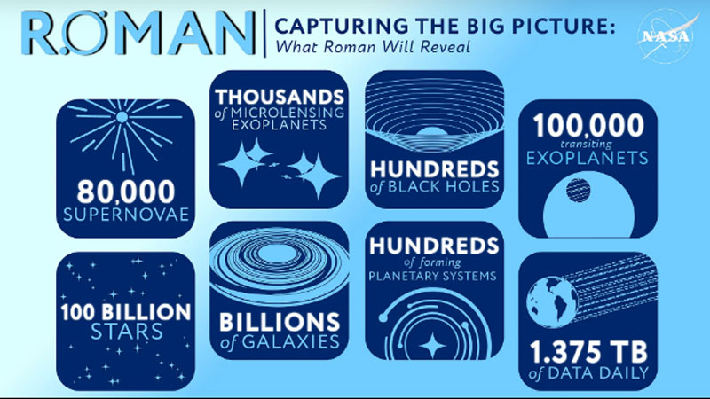 Огляд High-Latitude Time-Domain Survey допоможе уточнити природу темної енергії шляхом вимірювань наднових і слабкого гравітаційного лінзування. Огляд Galactic Bulge Time-Domain Survey за допомогою мікролінзування виявить десятки тисяч транзитних екзопланет, включаючи «планети-вигнанці» та об'єкти в обжитковій зоні далеких зірок, а також ізольовані чорні діри.