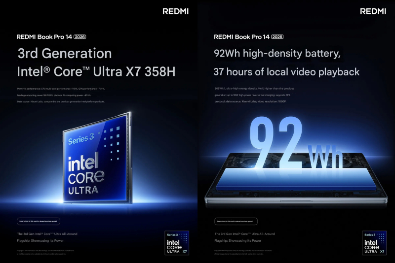 Компанія додає, що менший за розміром варіант Redmi Book Pro 2026 з процесором Panther Lake може працювати до 37 годин у режимі відтворення локального відео. Також підтверджена підтримка швидкої зарядки потужністю 90 Вт для моделі Redmi Book Pro 14 2026, але поки неясно, чи буде така ж потужність зарядки у 16-дюймовій версії.
