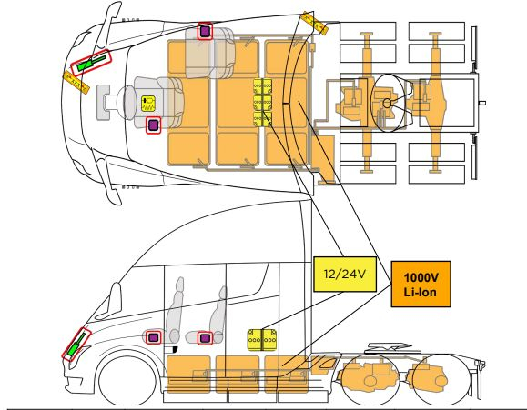 Багато компонентів Semi ділить з електричним пікапом Cybertruck, включаючи акумуляторні елементи типорозміру 4680 та 48-вольтову архітектуру допоміжних систем. Вона дозволяє зменшити масу проводки, що для електромобіля виливається в збільшення запасу ходу за інших рівних умов. Ураховуючи специфіку експлуатації, Tesla наділила вантажівки Semi здатністю підживлювати напівпричепи з рефрижератором не силами окремого дизельного генератора, а від акумуляторної батареї тягача.