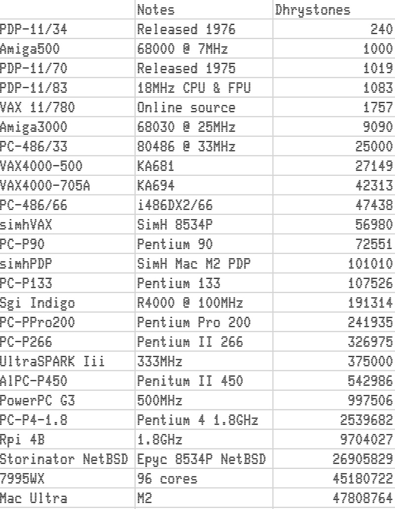 Бенчмарк Dhrystone 2.2 був обраний для тестування через його сумісність з усіма протестованими системами. Цей тест базується виключно на простих математичних операціях, у випадку векторизованого коду приріст продуктивності міг би бути ще більш помітним. Усі результати Пламмер зібрав в єдину таблицю, в якій PDP-11/34 набрав 240 балів, а «переможець» Mac Pro на M2 Ultra — 47 808 764 бали.