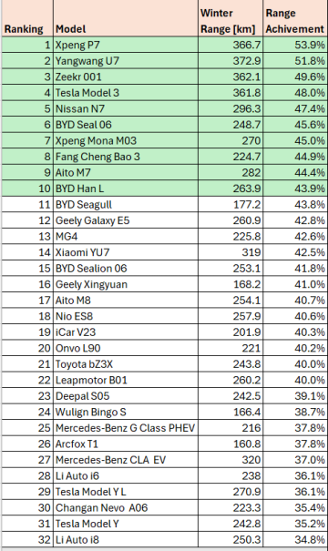 За запасом ходу в мороз найкращі результати показав електромобіль Xpeng P7, забезпечивши 53,9 % від заявленого запасу ходу за циклом CLTC (China Light Duty Vehicle Test Cycle). Холодна погода «з'їла» менше половини від повного заряду акумуляторів електромобіля. На другому місці розташувався електромобіль BYD Yangwang U7 з показником 51,8 %, а третє місце зайняв Zeekr 001 з показником 49,6 %.